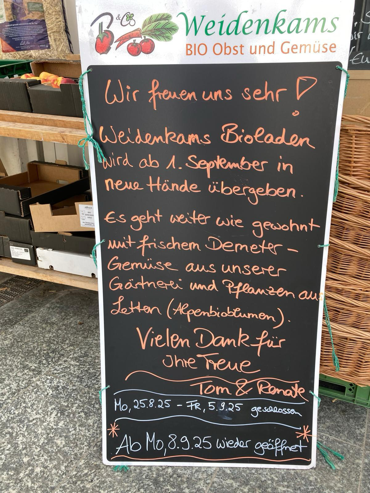 nun ist es offiziell: Wir freuen uns bekanntgeben zu können, dass Weidenkams Bioladen in Wolfratshausen bald unter neuer Regie weitergeführt wird. Nach vielen wundervollen Jahren, in denen wir Ihnen natürliche und gesunde Lebensmittel anbieten durften, haben wir uns dazu entschieden, den Bioladen abzugeben und in andere Hände zu übergeben.