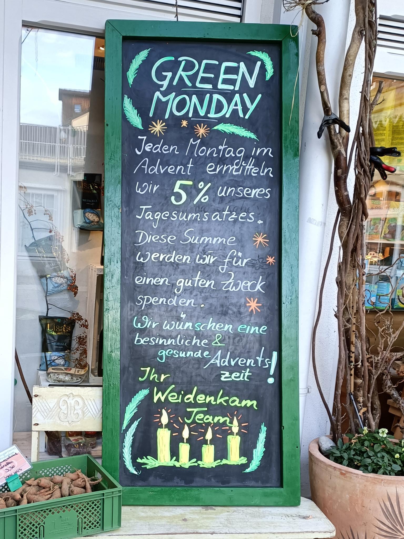 Wie letztes Jahr nutzen wir die Adventszeit, um einen "GREEN MONDAY" für unseren Bioladen in Wolfratshausen ins Leben zu rufen.
