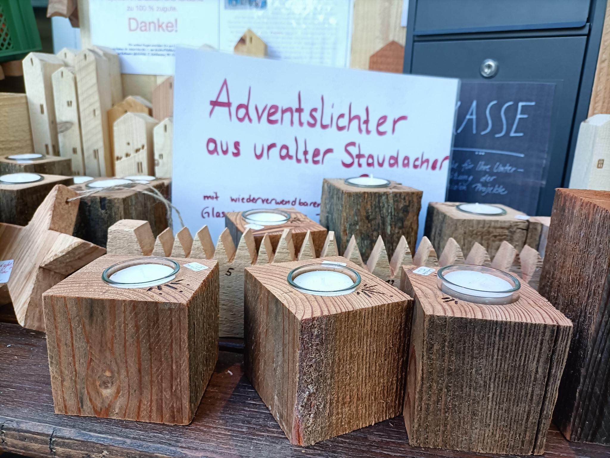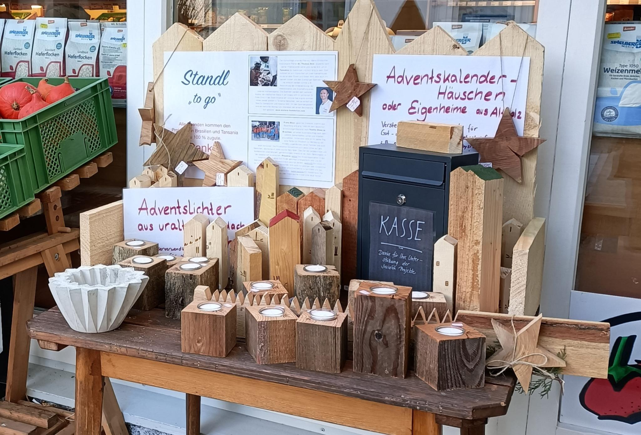 Eine engagierte Kundin aus Holzhausen stellt originelle, dekorative Holzarbeiten aus Altholz her und hat ihren hübschen Stand nun vor unserem Laden aufgebaut. Sie spendet den gesamten Erlös für die beschriebenen sozialen Projekte in Tansania und Brasilien.